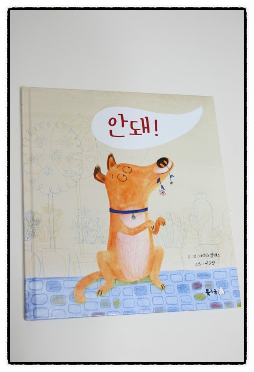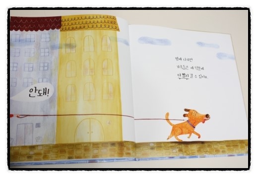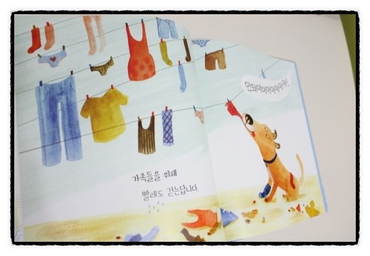 <안돼!>는 자신의 이름이 안돼라고 알고 있는 강아지가 주인공이에요. 안돼는 가족들을 위해(?) 하루 종일 쉬지 않고 일을 벌리지요. 물론 자신은 가족을 위하고 배려하기 때문에 하는 행동이라고 하지만 가족들 입장에서 보면 일거리만 더 만들고 불편을 겪는 일들이기 때문에 사고뭉치로 생각하게 되지요. 하지만 물론 가족들은 안돼를 사랑합니다. 늘 말썽을 피우고 어른들을 괴롭혀도(?) 우리 아이들을 사랑하는것처럼요. 안돼는 가족과 함께 외출할때 빨리 달려가서 가족들을 힘들게 하고 식사할 때 음식이 괜찮은지 먼저 맛보고, 빨랫줄에 널어놓은 옷들을 걷어놓는답시고 물고 잡아당겨 엉망으로 만들어 놓지요. 그 외에도 가족을 곤란에 빠트리는 일이 허다하니 가족들은 모두 강아지에게 "안돼!"를 외치게 되죠. 이 책을 읽으며 저도 우리 아이들에게 가장 자주 하는 말이 "안돼"라는 사실을 문득 깨달았다지요. 그 전엔 그냥 습관적으로 외치던 말이었는데 강아지 입장을 듣고(?)보니 너무 아이를 윽박지르고 못하게만 막지 않았나 하는 생각을 해보았어요. 아이들은 아직 뇌와 근육이 미성숙해서 하는 행동들일뿐인데 가끔은 엄마인 나를 괴롭히려 드는구나라는 착각마저 서슴치 않을 때도 있었으니 얼마나 어리석은것은 인간인가요.