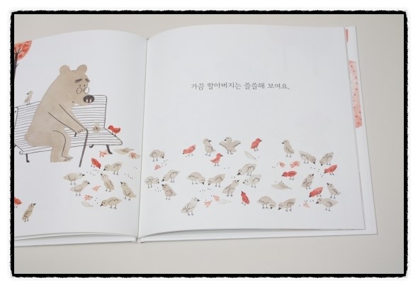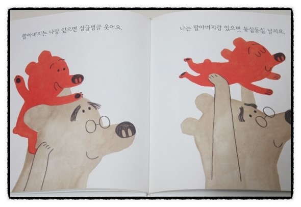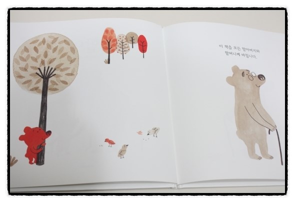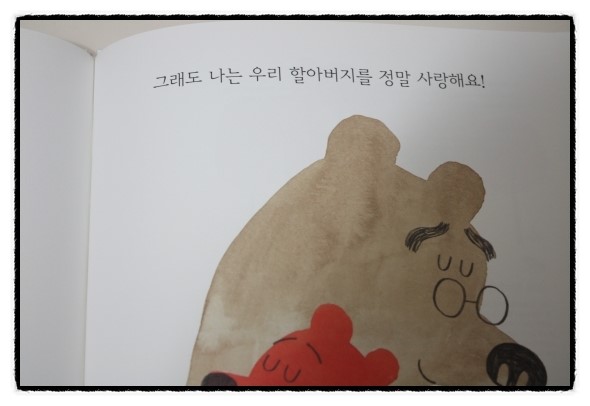 자신을 세상 누구보다도 사랑해주시고 또 사랑하는 할아버지 할머니가 계시다는것은 크나큰 축복입니다. 할아버지 할머니의 사랑은 아빠 엄마의 사랑과는 또 다른 더 깊은 무엇이 있으니까요. 이 책을 읽으며 우리 아이들이 얼마나 축복받은 아이들인가라는 생각을 해보았어요. 그리고 이 책을 읽으며 엄마인 저는 더욱 숙연함을 느끼게 되었구요. 아이는 할아버지 할머니에 대한 사랑을 다시 한번 되새겨보는 기회가 되었어요. 우리 아이는 아직 어려서인지 책속에서 할아버지가 집안에서 길을 잃어버린다는 내용을 잘 이해하지 못합니다. 하지만 자신도 할아버지 할머니를 너무너무 사랑한다고 큰소리로 외치네요. 그러더니 할머니께 달려가서 뽀뽀를 하는 녀석. 역시 책의 힘은 큽니다. 이렇게 바로 몇 페이지의 그림과 글만으로도 할아버지 할머니의 큰 사랑을 다시 한번 생각하게 되는 계기를 만들어주니까요. 하지만 엄마인 저는 할아버지가 집안에서 길을 잃어버리고 꼬마곰을 알아보지 못한다는 부분에서 살짝 슬픔을 맛보았네요.
