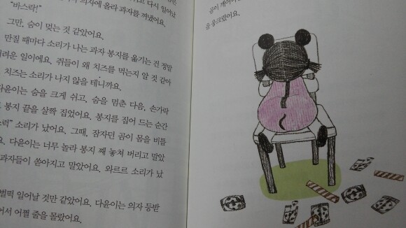 곰이 꺠면 안돼요 바스락 아 바스락...과자봉지 소리에..잠자던 곰이 몸을 비틀