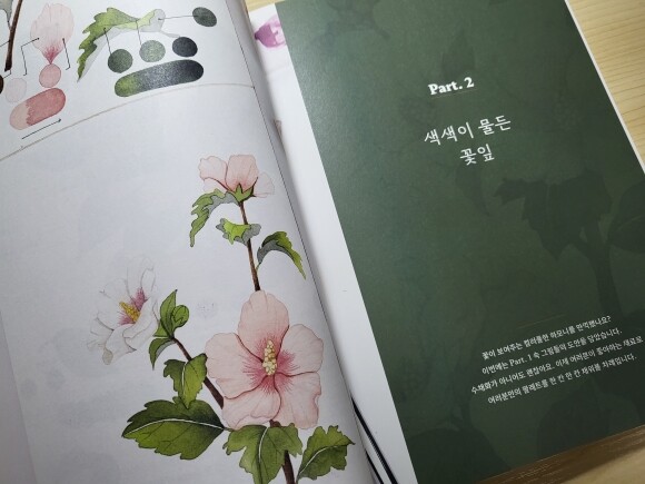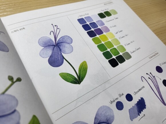 작품에 사용된 색상의 이름과 물의 양에 따른 색을 자세하게 보여주면서 따라할 수 있도록 되어있고 작품 하나하나 QR코드를 확인하면서 기법들을 익힐 수 있다.