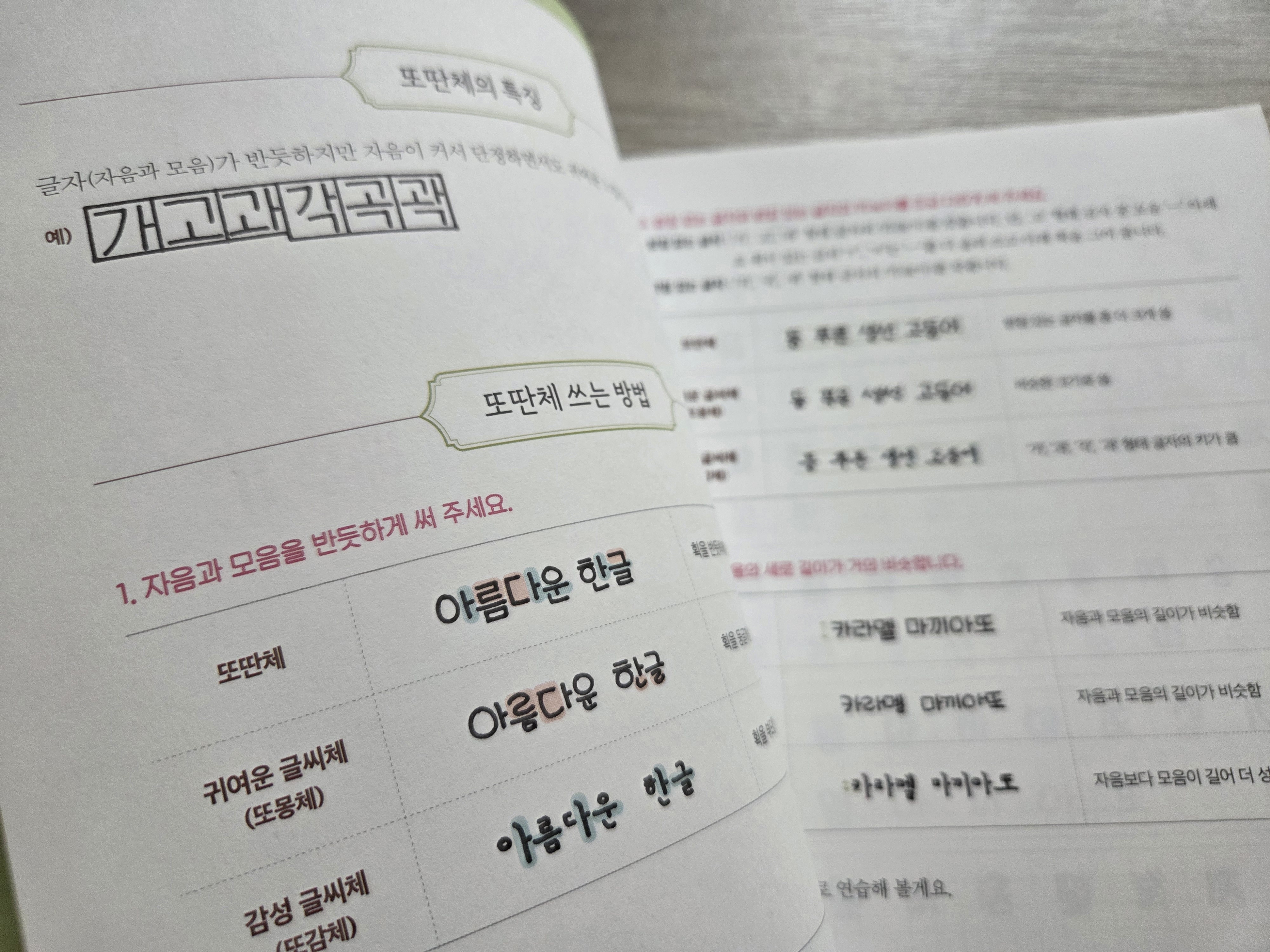 책에서는 세가지의 글씨체를 선보이고 있다. 또딴체, 또몽체, 또감체로 각각의 설명이 구분되어 있으며 실생활에서의 활용법도 안내하고 있다.
