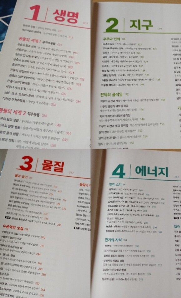 생명의신비,활동하는 지구,물질과 에너지,천체와 우주