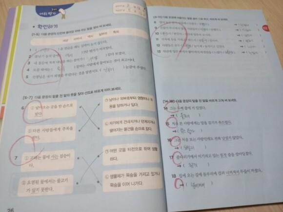 빨간색으로 문장의 뜻을 써서 해당되는 문장을 골라 문장을 완성하면서