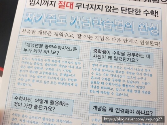 중학수학의 개념을 질문에 대한 답으로 알아보기 쉽도록 정리되어 있어서