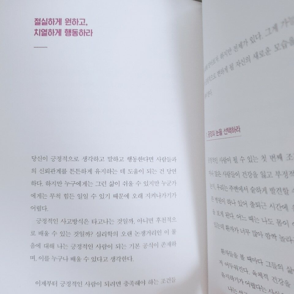 요즘 긍정에세이에 푹빠졌다. 부정적임을 기질로 가지고 태어났다해도 과언이 아닐정도로 부정적인 마인드의 소유자였던 나도 긍정에세이들을 매일 읽고 긍정적이려고 노력하니, 정말 긍정적인 성격이 되어가는 것 같다. 천성은 변하지 않겠지만, 그래도 이렇게 노력이라도 하려는 내 자신을 기특하게 여기기로 했다.