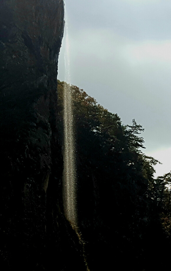 높이를 가늠하기 어려운 바위 위에서 쏟아지는 물이 햇살을 품었다. 음과 양은 서로 기대어 빛난다고 했던가. 떨어지는 물줄기가 그늘에 들어 더 빛난다.