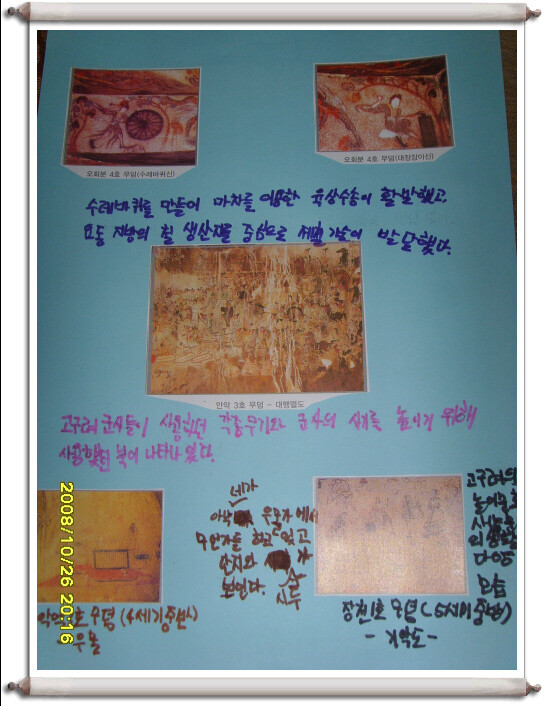 하지만 이 책을 보면서 알게 된 점은 너무나 많다.벽화를 통하여 당시의 옷이나 집,무기,놀이,도구,신앙 등 생활상의 모습을 짐작케 하는 부분이 너무나 많았고, 그 당시의 웅장하고 화려했던 고구려인의 삶의 모습을 느낄 수 있었다.