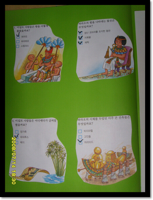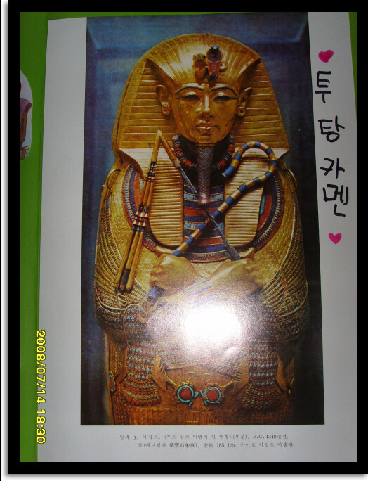 람세스를 비롯한 투탕카멘과 같은 파라오 이야기, 이집트인들이 사용했던 문자, 그리고 음식들을 설명하면서 우리가 쉽게 구경하지 못하는 상형문자,민중문자와 같은 화보를 자세히 보여주며 설명하고 있어서,이집트의 역사를 앉은 자리에서 이해 할 수 있도록 도와 주고 있다.