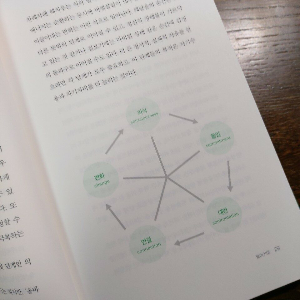 100%는 아니지만 꽤 많은 내용들이 내 증상과 겹치다보니 책을 더 몰입해서 읽게 되었다. 일단 책에 실린 자가 진단표로 진단을 해볼 수도 있었고 중반부에서는 이 증상의 치유 과정을 배우며 따라해보았다. 저자가 제안하는 치유 방법은 의식, 몰입, 대면, 연결, 변화 이렇게 다섯단계로 진행된다.