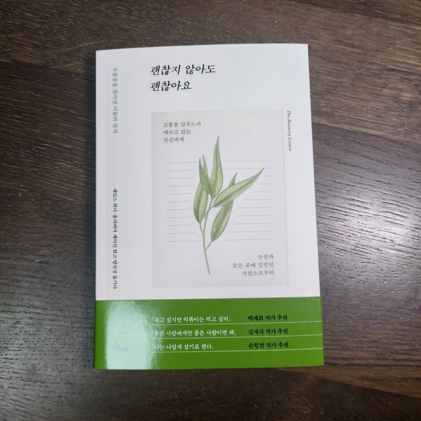 개인적으로는 괜찮지 않아도 괜찮다는 책 제목부터가 가슴에 확 꽂히는 느낌이었고 책의 구성은 2012년에 시작되어 현재까지 지속되고 있는 ‘치유의 편지’ 캠페인의 그 편지들을 그대로 엮은 형식이다. 이런 실제로 우울증에서 치유된 사람들이 현재 우울증을 앓고 있는 사람들에게 편지를 쓰는 캠페인은 국내에도 도입하면 참 의미있는 행사가 될 듯 하다.