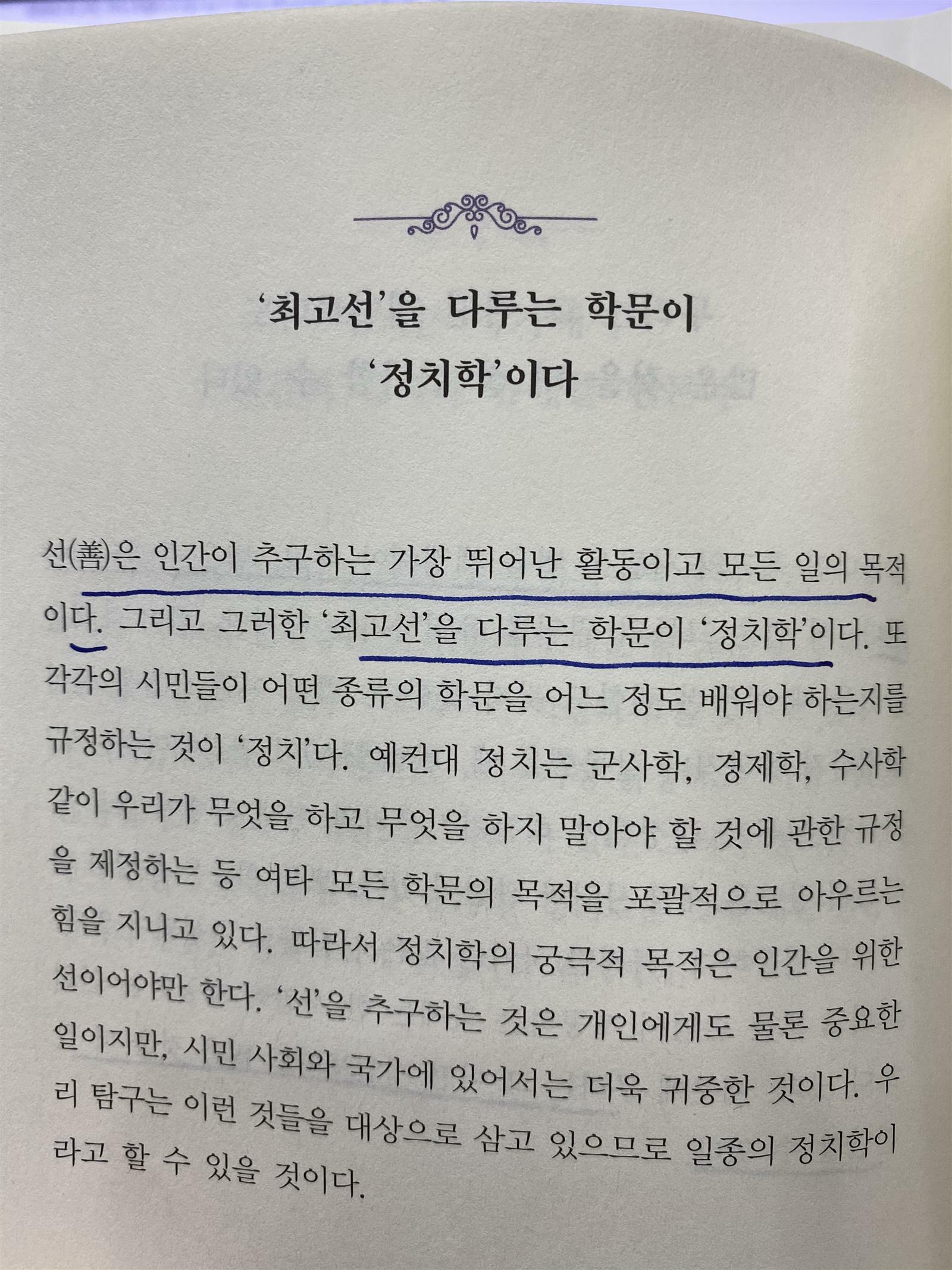 ‘6장. 정치란 무엇인가’에서도 많은 것을 분명하게 정리할 수 있었습니다. “인간은 본래 사회적 동물이다”(p. 127). “인간은 동물 중에 최고이지만, 법과 정의에서 분리되면 가장 최악이다”(p. 128). “그렇다면 최고의 사람은 법을 제정해야 하고, 법은 통과되어야 한다. … 법이 어떤 요점을 전혀 결정하지 못하거나 잘못했을 때, 현인(賢人)이 결정해야 하는가? … 모든 회중은 분명히 현인보다 열등하다. 하지만 국가는 많은 사람들로 구성되어 있다. … 때문에 무리는 그 어떤 개인보다도 많은 것을 더 잘 판단할 수 있다.”(p. 129). “선(善)은 인간이 추구하는 가장 뛰어난 활동이고 모든 일의 목적이다. 그리고 그러한 ‘최고선’을 다루는 학문이 ‘정치학’이다”(p. 130). 그의 글에서 인간의 본질과 민주주의의 정치학에 대한 많이 배우고 많이 생각하게 되었습니다. ‘7장. 인간 행동에 대하여’와 ‘8장. 일과 삶에 대하여’에서도 유익한 문장들을 많이 접했습니다. 좋은 가문에서 태어난 사람, 즉 소위 금수저들에게는 어떤 특징이 있는지, 인간 행동의 7가지 원인은 무엇인지, 공동의 보석을 파괴하는 나쁜 자들은 어떤 자인지, 빈부격차를 해소하기 위해서는 무엇을 관리해야 하는지 알고 싶다면, 이 책이 제격입니다. 가볍게 독서하면서 묵직한 삶의 진리들을 얻을 수 있는 멋진 책입니다.