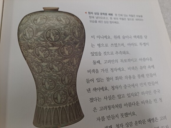 상감 기법으로 만들어진 청자 상감 운학문 매병의 으뜸인 이유도 소개되어 있는데요, 그 때 당시 오차 없는 완벽한 황금비율을 담아내고 독보적이고 아름다운 비색을 구워낸 고려인들의 솜씨를 알 수 있답니다.