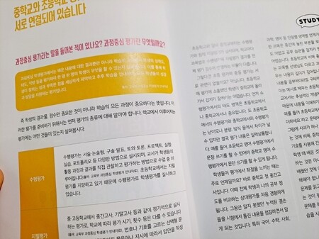 과정중심평가방법이라는 것은 동일하지만 초등학교는 수행평가로, 중학교는 수행평가 + 지필평가로 능력을 평가하지요.
