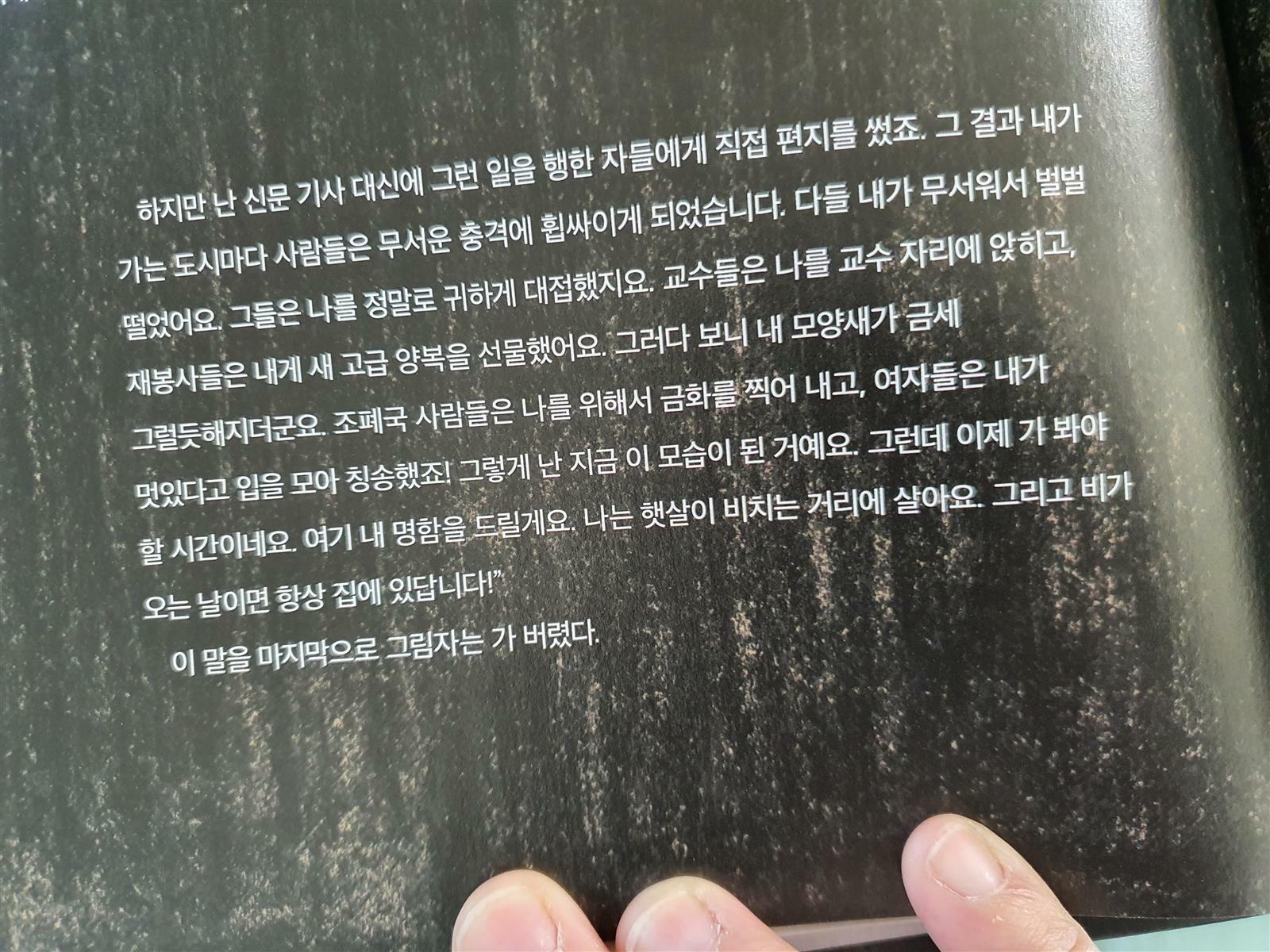 햇살이 비치는 거리에 살고, 비가 오는 날에는 늘 집에 있을 수 밖에 없는 그림자일 뿐이란걸 다시 상기시켜준 부분이였다.