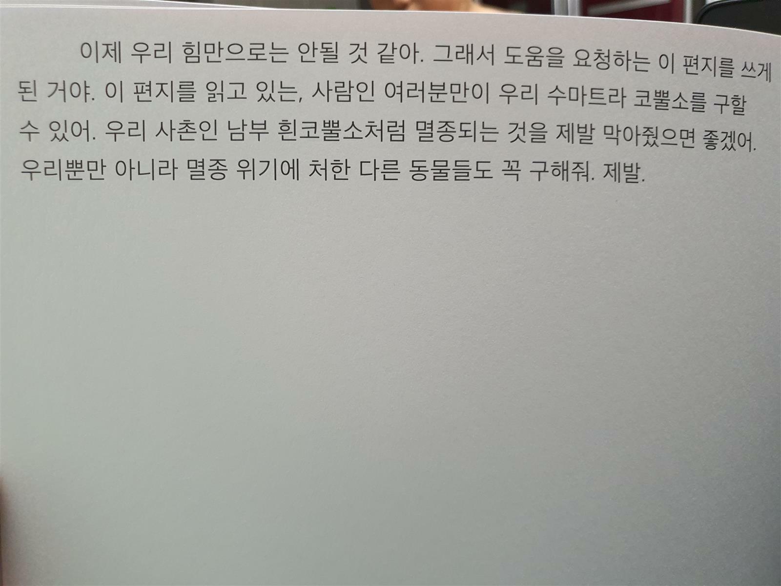 코뿔소가 아이라는 점에서 너무 마음이 아팠다. 나도 아이를 키우는 입장에서 아이를 잃은 부모, 부모를 잃은 아이는 늘 가슴아픈 이야기다. 동물이라도 해서 다를까? 지구상에 사는 생명체 중에서 지구를 파괴하는 생명체는 인간 뿐이라고 한다. 옛날에는 먹고 살기위해, 또는 가죽으로 옷 등을 만들어 입기 위해, 꼭 필요한 만큼의 사냥만 했었다고 생각한다. 하지만 지금은 어떨까? 야생동물을 마구잡이로 사냥하지 않아도 키우고 있는 가축이 있다.