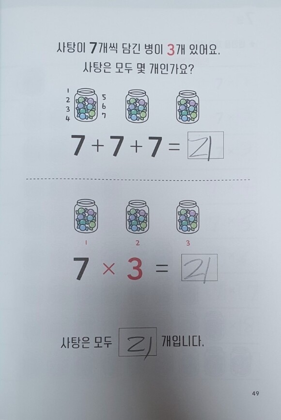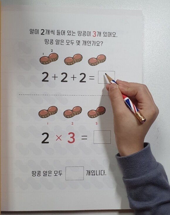 둘째, 구구단의 원리를 쉽고 재미있게 배울 수 있도록 구성되어 있어요. 처음에 덧셈을 통해서 곱셈의 원리를 설명해 주네요. 예를 들면 알이 2개씩 들어 있는 땅콩이 3개 있어요. 땅콩 알은 모두 몇 개인가요? 2+2+2 = ? 이후 2*3= 순으로 원리를 배우고 이해한 다음에 곱셈에 대한 문제를 풀 수 있도록 구성되어 있어요.