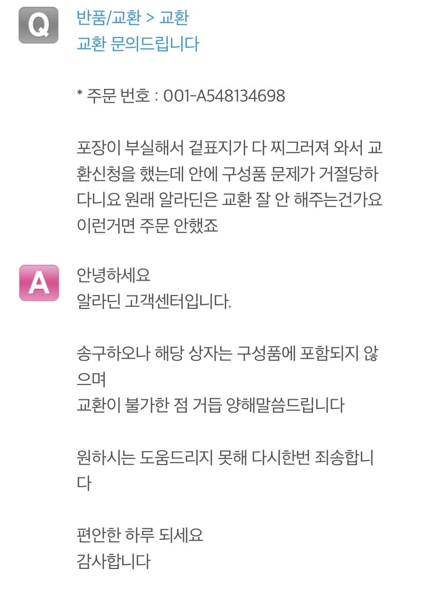 바닥에 완충제 하나 까는게 뭐 어렵다고 처음부터 포장을 잘 하던가 싶습니다. 저도 직원분들도 힘드실까봐 쓴 돈에 비해 교환 요청 자주 안 하는 편입니다. 그냥 5천원도 아니고 3만원하는 한정판이 모서리가 찌그러져 왔는데 교환도 안 해주는지 모르겠습니다. 가득이나 오도착당해서 물건을 4일이나 늦게 받았는데 찌그러져와서 뜯지도 못하고 교환요청하느라 절망했는데 교환 해달라고 문의 넣었더니 박스 찌그러진건 안된다고 거절까지 당했습니다.