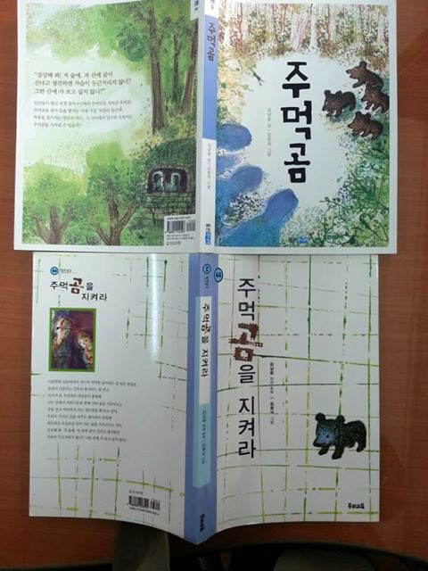 강수와 우림이가 곰 동화제를 먹고 곰의 이야기를 다 듣고 통역해주는 노릇을 하는 대목(주먹곰은 왜 주먹곰인가, 145쪽)이 나온다. 마치 전설처럼 기승전결을 단번에 우리 독자들에게 프리젠테이션하듯 다 알려주는데 좀 맥이 빠진다. 더군다나 주먹곰은 이름이나 자신들 사이의 관계, 성별, 나이가 나오지 않아 막연한 대상으로 다가온다. 주먹곰이 제목이지만 주인공은 주먹곰을 둘러싼 우리 인간들의 모습과 행동이라는 생각이 든다. 그런 면에서 우리교육에서 나온 2007년판 <주먹곰을 지켜라>에 비해 <주먹곰>(웅진주니어, 2013)의 개정판 표지그림이 더 나아보인다. 그림작가 김중석의 난만한 선은 친근하고 정감 있어 이야기로 독자를 이끌어들인다.