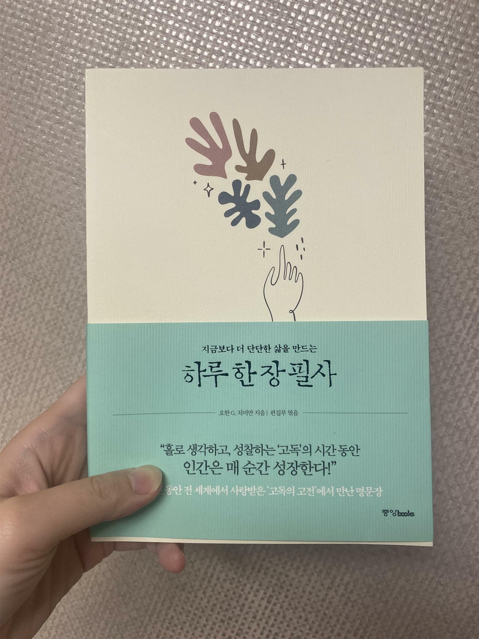 좋은 글귀는 좋은 생각을 가져다 준다. 알록 달록 예쁜 그림들은 지친 일상에서 약간의 휴식을 가져다 주는거 같다. 혼자만의 시간을 가지기에 ... 그리고 삶에서 나를 되돌아 보기에는 필사만한게 없는 거 같다 좋은 기운들과 그 문구를 보면서 새로운 생각들을 하게 된다! 이책은 쇼펜하우어를 60년 앞선 '근대 고독 담론의 선구자' 요한 G. 치머만의 일과 행복, 사랑에 몰입하기 위한 '고독의 미학'을 온전히 느낄 수 있는 책이다. [지금보다 더 단단한 삶을 만드는 하루 한 장 필사]는 철학자의 말을 귀기울수 있도록 해주고 하루에 한쪽씩 쓴다면 일상의 번잡함과 인간관계의 번거로움에서 벗어나 온전히 나 자신을 바라볼 수 있을꺼 같다. 글씨를 잘 쓰지 않는 사람도 한번씩 쓰면서 마음을 정돈할 수 있는 이 가을에 딱인거 같다! 이 책을 활용하는 방법도 나와 있어서 아주 유용하다! 이 책은 별도의 장 구분이 없는 책입니다. 책의 처음부터 매일 한 장씩 필사를 진행해도 되고, 마음이 내키는 페이지를 자유롭게 펼쳐서 글쓰기를 해도 무방합니다. 어떤 페이지를 펼쳐도 나를 발견하고, 또 성장할 수 있는 저자의 주옥같은 명언이 새겨져 있습니다. 필사를 하고 남은 여백에는 그날 그날의 생각이나 고민, 깨달음과 같은 메모를 남겨도 좋습니다. 책 한 권의 필사를 모두 끝낸 후에는 혼자 있어 고독하다고 생각이 문득 드는 어떤 날, 한 페이지를 펼쳐보며 자신의 글씨를 가만히 감상해 보세요. 필사를 하던 날 어떤 생각을 하며 글을 썼는지, 또 어떤 기분을 느꼈는지를 가만히 되짚어 보면 참 좋을 꺼 같다!