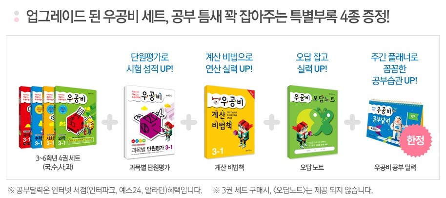 우공비 공부달력과 과목별 단원평가, 계산비법책은 부록입니다.
