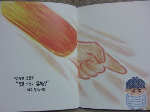 첫 장을 넘기면 엄마의 무시무시한 커다란 엄지손과 주눅이 들어있는 아들 모습이 보여요!!