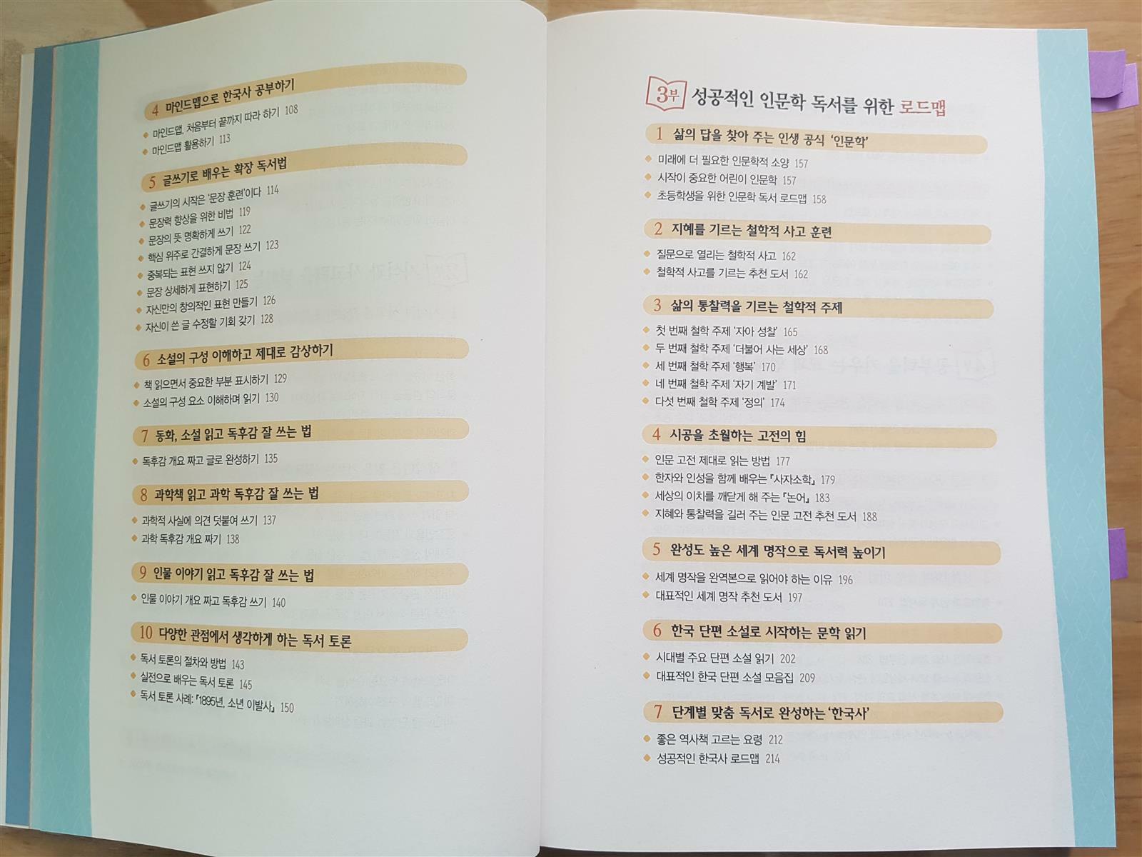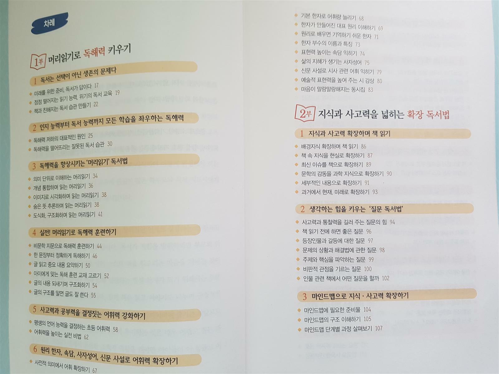 목차에서 보다시피 독서로 독해력키우는방법, 사고력 넓히는 확장 독서법, 인문학 독서를 위한 로드맵 등 제대로 책을 읽고 독해력 사고력 등을 키우는 방법을 제시하고, 초등생들을 위하여 학년별로 교과 연계하여 독서하는 방법도 제시되어 있다.