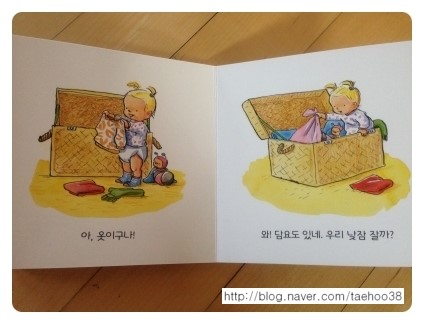 안을 들여다 보니 옷이 들어있고 담요도 있어요..