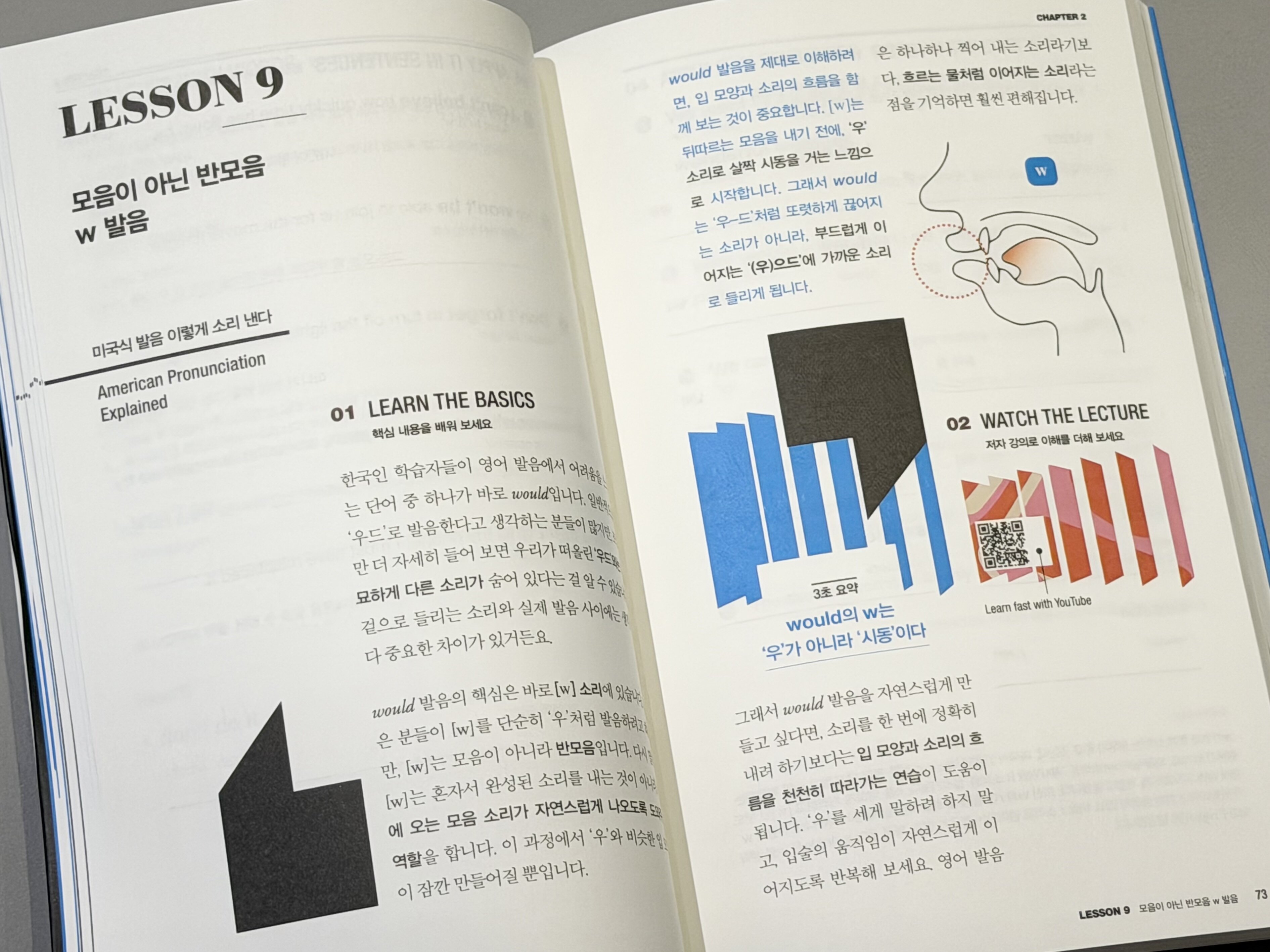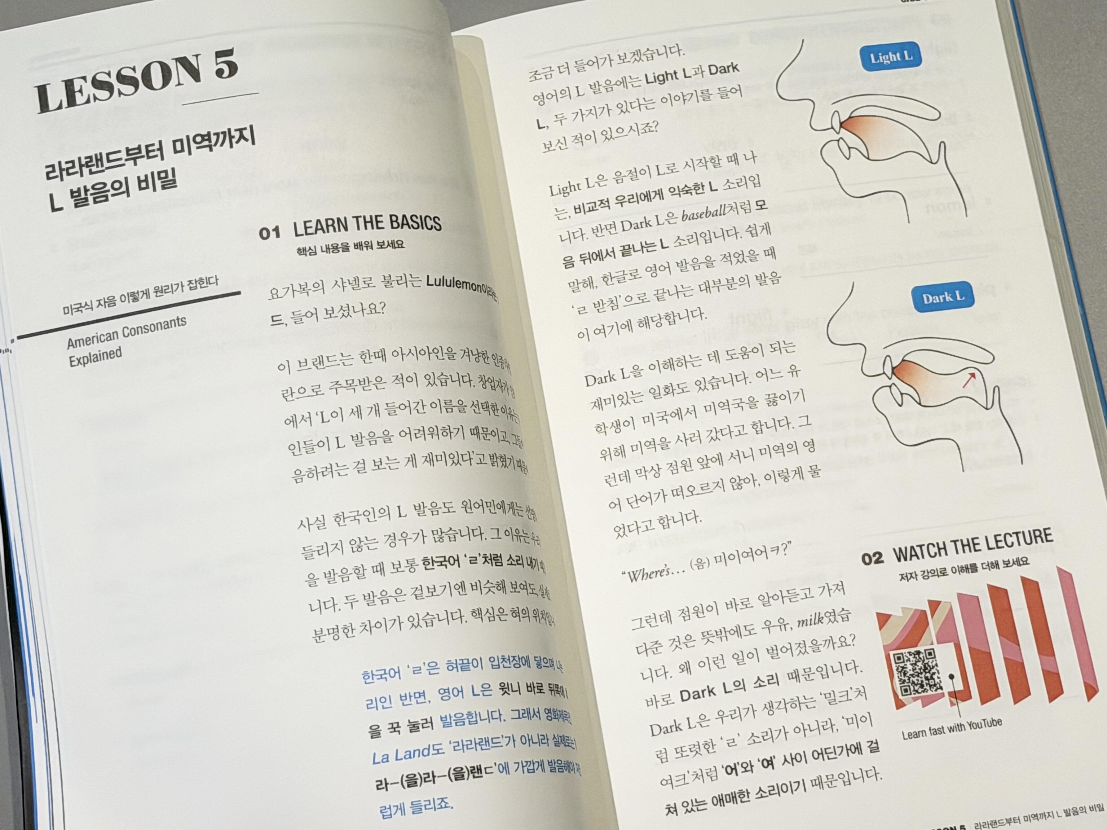 한국인이 가장 어려워하는 r 발음, 라라랜드부터 미역까지 L 발음의 t와 d, 소리가 아니라 바람에 가까운 h 등 미국식 발음을 완성하는 핵심 자음 소리부터 모음 소리, 연음의 원리, 축약의 원리 등으로 구분해 충분히 따라해보고 연습해 볼 수 있도록 구성되어 있다. 왜 그런 발음이 만들어지는지 그 원리를 직관적으로 이해할 수 있도록 구성해, 불필요한 이론 대신 실제 발화에 바로 적용되는 핵심 원리만 담았다. 필요한 부분에 QR 코드를 수록해 저자 강의를 들으며 학습할 수 있도록 했고, 원어민 음성을 들으며 정확한 발음을 확인할 수 있도록 각각의 장마다 MP3 음원도 제공된다.