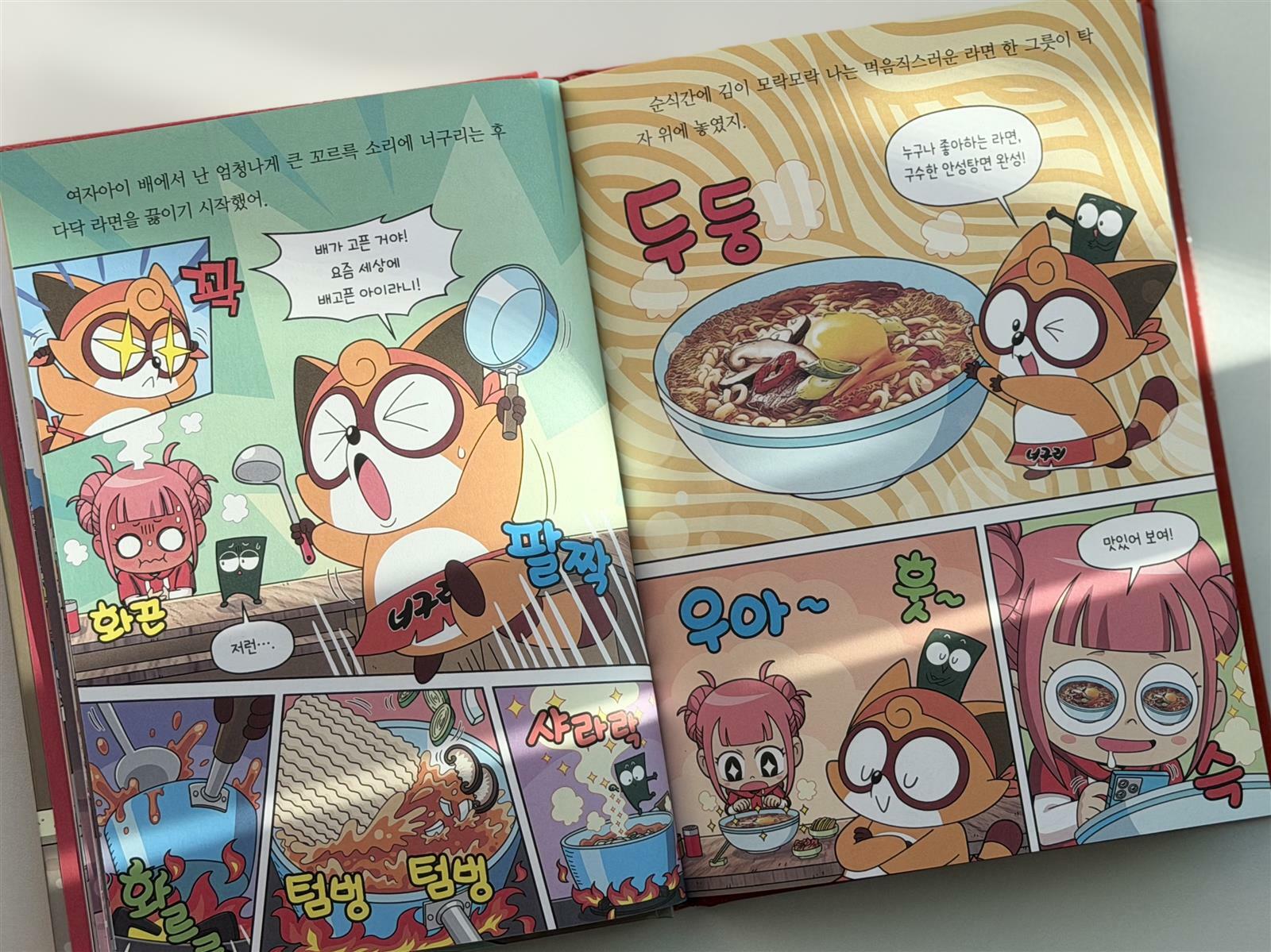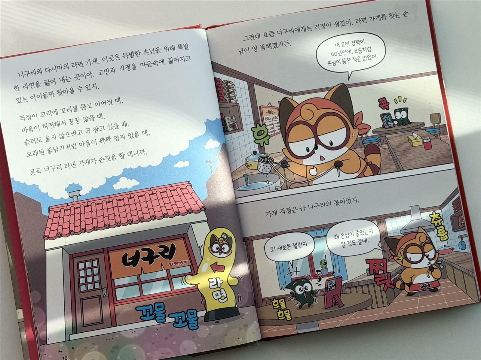 걱정스러운 표정으로 나타난 어린이 손님에게 화려한 솜씨로 딱 맞는 라면을 만들어 내는 너구리의 요리 솜씨를 보는 재미도 쏠쏠하다. 동화와 만화를 자유롭게 오가는 구성이라 저학년 아이들부터 라면을 좋아하는 고학년 아이들까지 모두 재미있게 볼 수 있을 것 같다. 국민 간식인 라면의 역사와 라면에 관한 각종 질문을 모아 둔 페이지도 있어 유익한 정보도 얻을 수 있다.