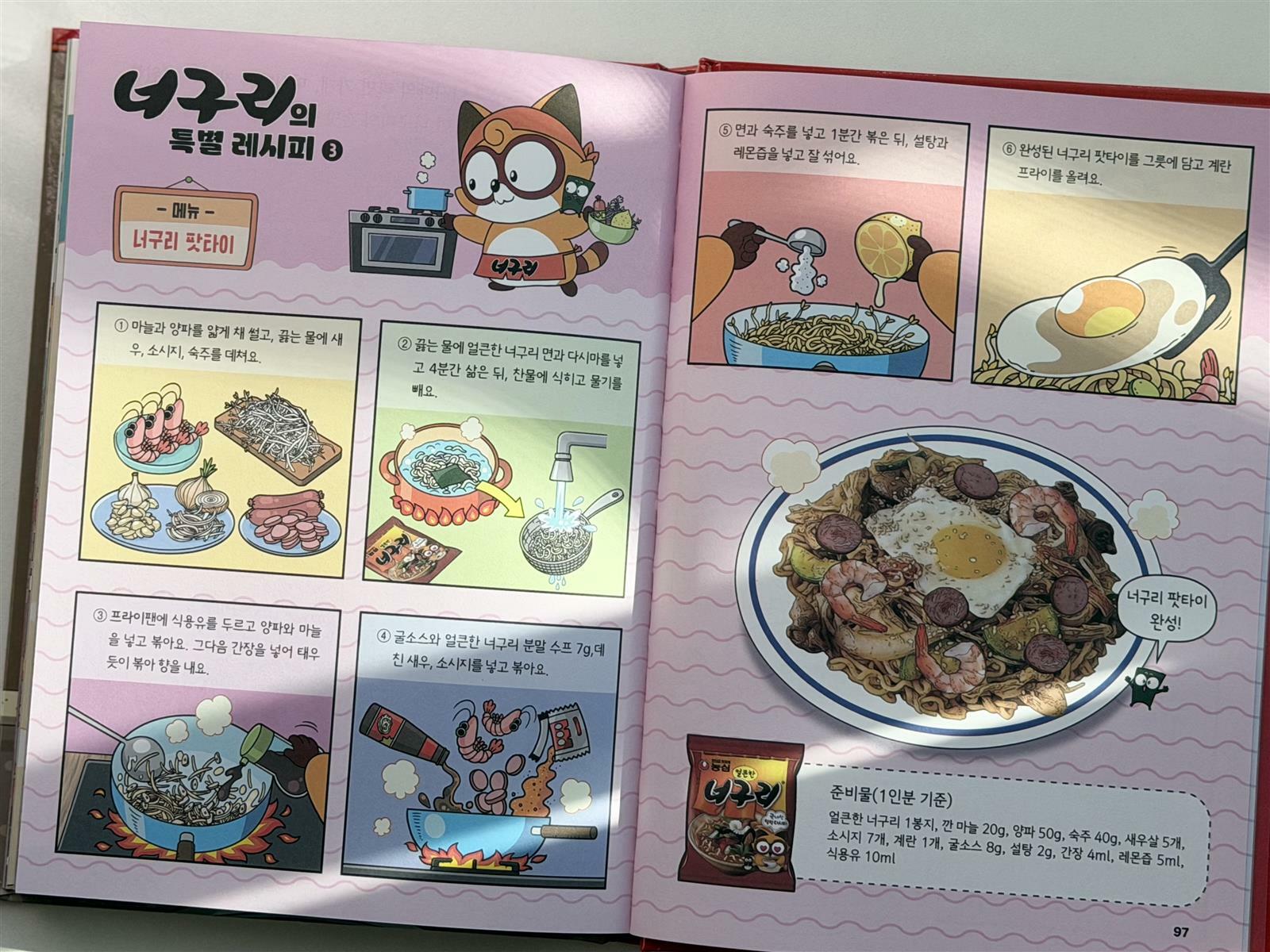 창립 60주년을 맞은 대한민국 대표 라면 브랜드 농심과의 협업을 통해 출간한 동화라서 페이지 곳곳에 라면이 등장한다. 각 장면에 등장한 라면들은 특별 레시피로 소개되어 있어 누구나 직접 요리해볼 수 있도록 되어 있다. 토마토와 계란이 들어가는 신토달마, 육개장 사발면을 이용한 육사 피자, 배홍동 비빔면을 이용한 배홍동 물비빔면까지 세 가지 라면 레시피를 만나볼 수 있었다. 아이와 함께 이야기에 등장하는 라면을 직접 만들어 보면 더 뜻깊은 시간이 되지 않을까 싶다. 요리를 통해 직접 해보는 독후활동이라니 신선한 발상이 아닐 수 없다.