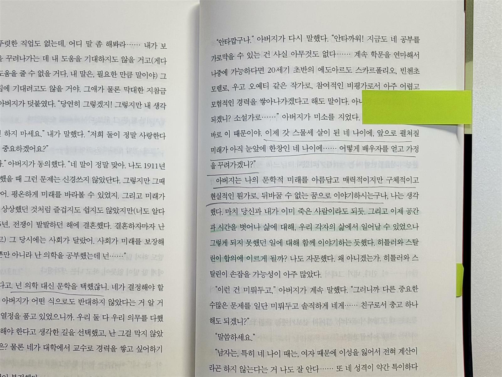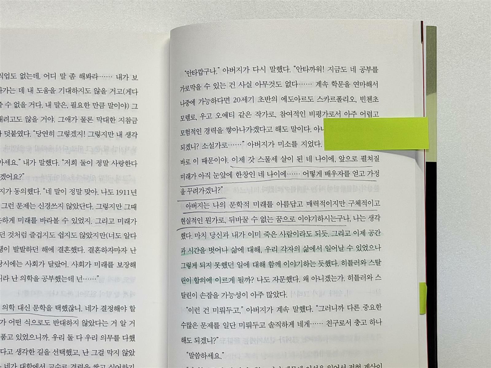 아버지는 나의 문학적 미래를 아름답고 매력적이지만 구체적이고 현실적인 뭔가로, 뒤바꿀 수 없는 꿈으로 이야기하시는구나, 나는 생각했다. 마치 당신과 내가 이미 죽은 사람이라도 되듯. 그리고 이제 공간과 시간을 벗어나 삶에 대해, 우리 각자의 삶에서 일어날 수 있었으나 그렇게 되지 못했던 일에 대해 함께 이야기하는 듯했다. 히틀러와 스탈린이 합의에 이르게 될까? 나도 자문했다. 왜 아니겠는가. 히틀러와 스탈린이 손잡을 가능성이 아주 많았다.             p.335