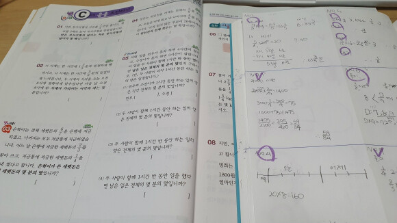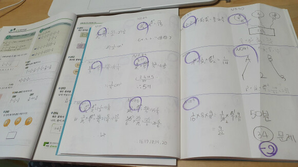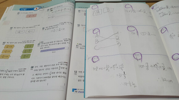 쎈 들어가기전 쎈에 대한 부담감이 있었던 탱탱이는 타교재를 먼저 테스트삼아서 수학노트풀이법으로 진행을 해보았습니다, 개념과 응용편에서는 그래도 이정도면 되었다면서 쎈 5-2 풀이를 시작했습니다.