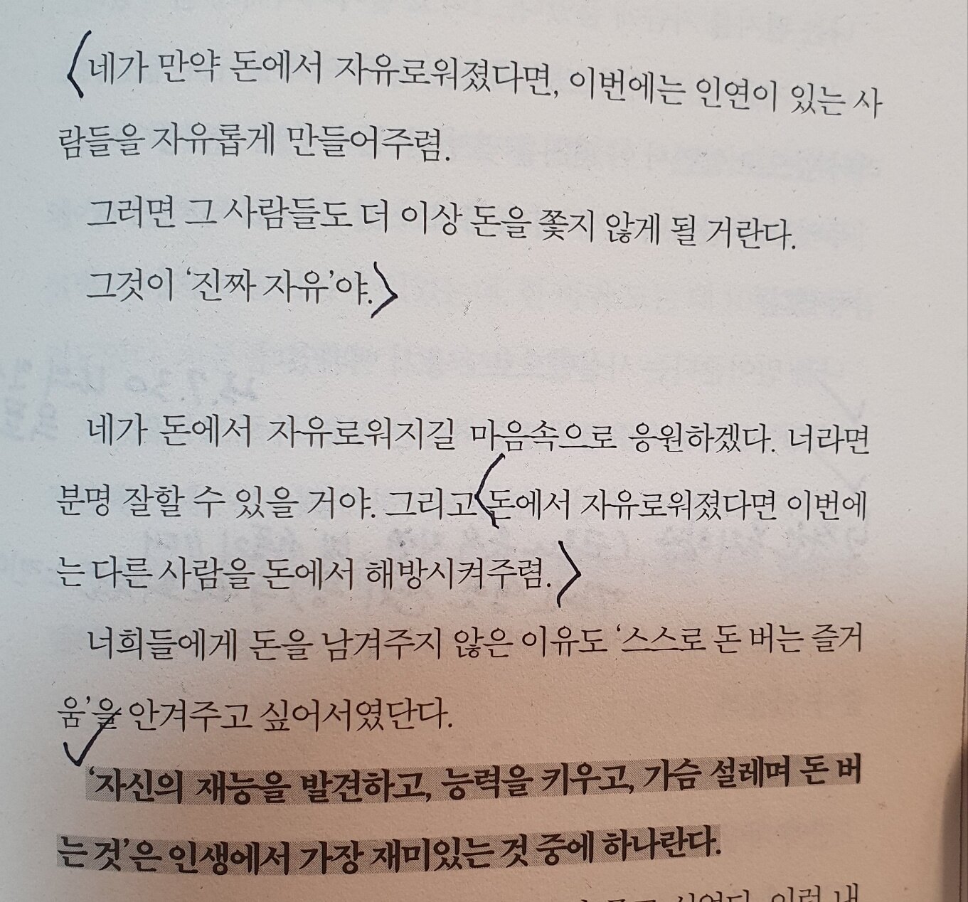 돈에서 자유로워지기 위해서는 ‘돈과 행복은 관계없다‘라는 사실을 알아야 해. 그리고 누군가를 행복하게 해주는 것이 마음의 가장 좋은 양식이란다. 누군가를 행복하게 해줄 때마다 ‘내 그릇‘이 커지고, 돈에서 자유로워질 거야.