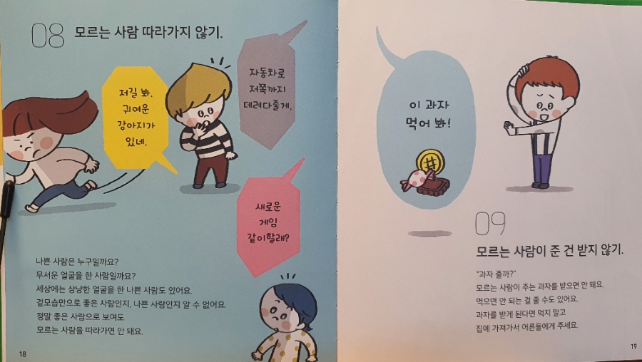 귀여운 강아지나, 간식, 게임으로 유혹을 하더라도 모르는 사람은 절대 따라가면 안되요. 모르는 사람이 주는 음식도 먹어서는 안되겠죠.
