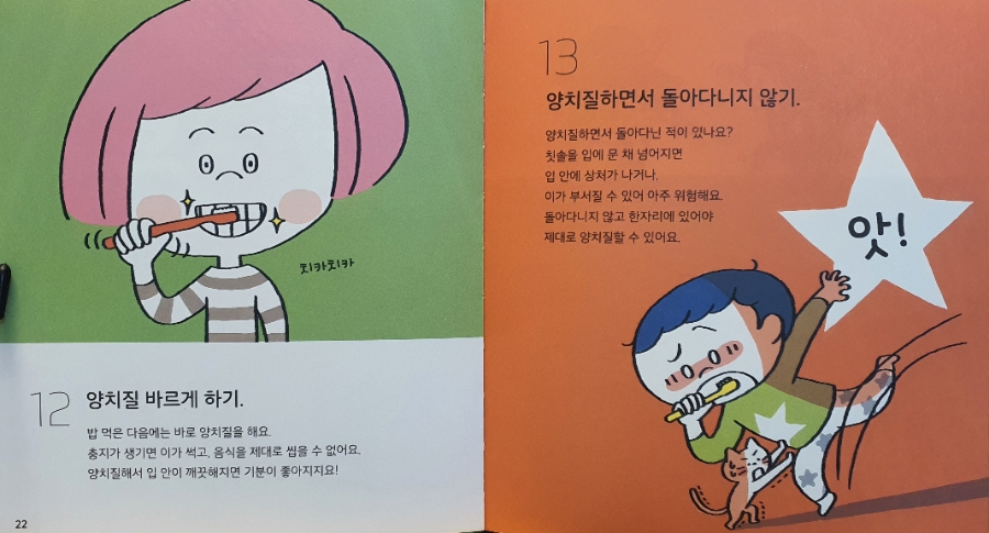 그래서 저는 양치질이 필요한 이유에 대한 영상을 보거나 책을 이용해요.