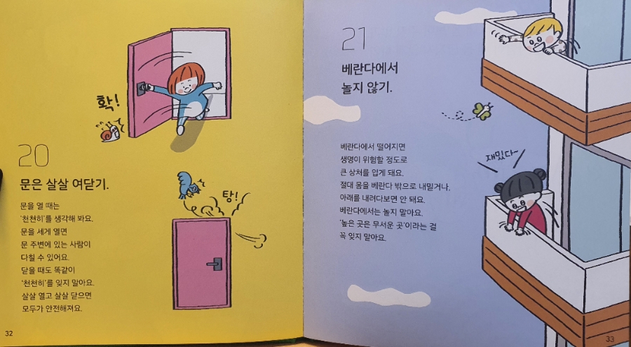그림으로 직관적으로 보여주면, 아이들이 아파트에서 슬기롭게 생활하는 방법을 알 수 있어요.