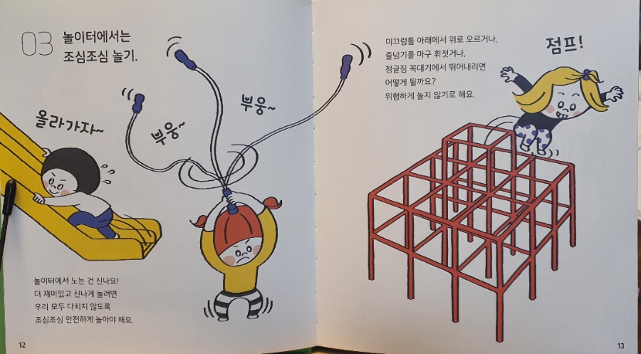 놀이터에서 놀기 전에 규칙을 알려줄때 책을 읽으면 좋을 것 같아요.