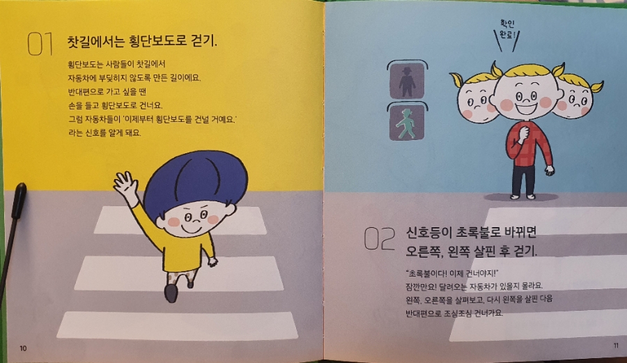 신호등이 초록불로 바뀌면 오른쪽, 왼쪽 살핀 후 걸어야되고요.