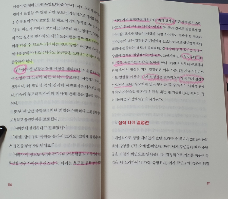 영유아기때부터 내 몸의 주인은 나라는 인식을 가지는게 자기 결정권을 배우는 것이라고 해요. 아이가 뽀뽀하기 싫다고 이야기 하면 "엄마, 아빠가 이것도 못하니?" 라고 말하며 뽀뽀를 하면 상대방의 동의 없이 상대의 경계를 침범하게 되는 거죠.