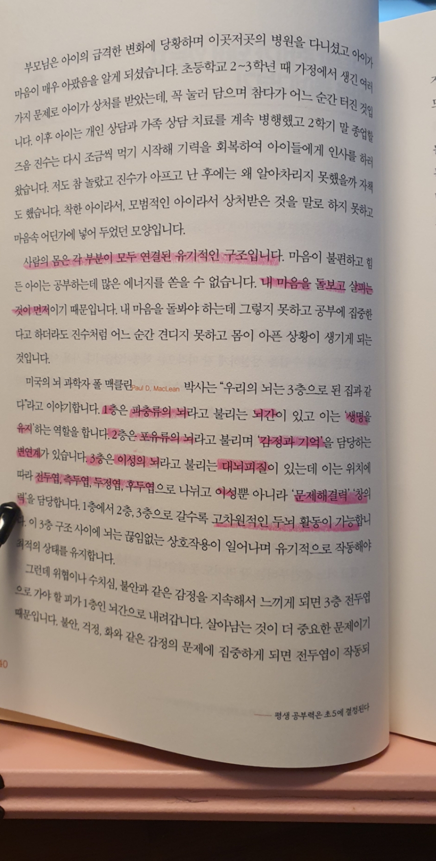 p40 사람의 몸은 각 부분이 모두 연결된 유기적인 구조입니다. 마음이 불편하고 힘든 아이는 공부하는데 많은 에너지를 쏟을 수 없습니다. 내 마음을 돌보고 살피는 것이 먼저이기 때문입니다.