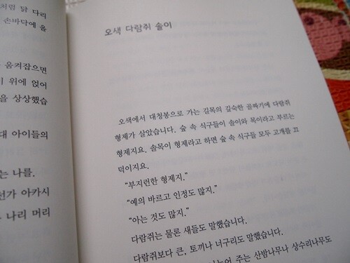 그 중에서 오색 다람쥐 솔이에 대한 이야기인데요. 다람쥐 솔이와 목이는 아는 것도 많고 예의 바르고 인정도 많으며 거만하지도 않아요. 숲 속을 떠나 넓은 세상에서 많은 것을 배워오라는 아버지의 말에 처음으로 사람들이 사는 곳으로 내려갑니다.