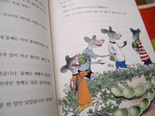먹을 것이 없어 먹을 것을 찾아 나선 네 마리의 생쥐는 완두콩 네 알을 봅니다. 모두둘 하나씩 먹고 힘을 내어 어머니에게 드릴 먹을 것이나 약을 구하자고 합니다. 하지만, 막내는 입 안에 넣어 삼키지 못하고 이를 탐내는 참새나 까치를 피해 어머니에게 전해 드릴려고 뛰어 가다가 연못에 빠뜨리고 맙니다. 붕어에게 사정 이야기를 해서 어머니를 위해 집으로 달려가는 막내 생쥐의 효성은 지극합니다.