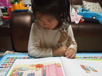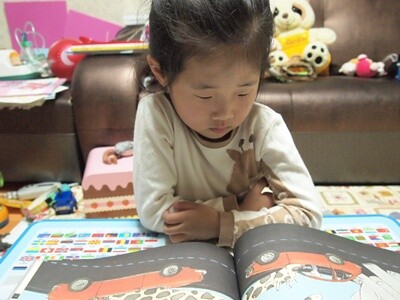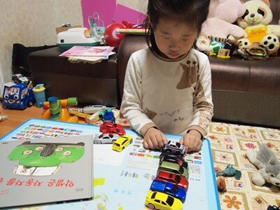 책을 다 읽자마자 조금전에 가지고 놀던 자동차들을 일렬로 세웁니다.