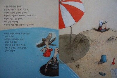수영하는게 오리의 의무라고 말하는 아빠 오리의 말에도 악셀은 모래로 자동차를 만들어
