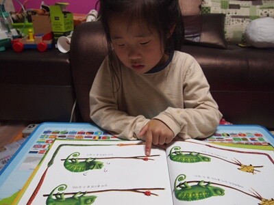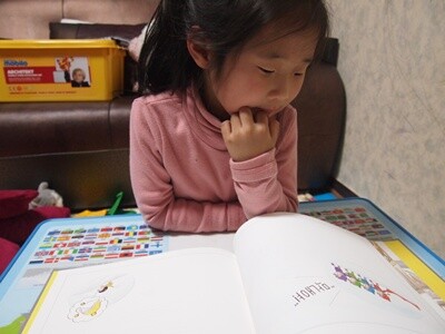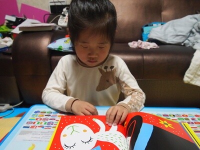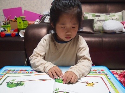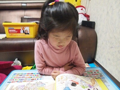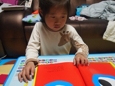 책 (이때 책도 빨강에 관련된 내용)을 들고 있는 아이