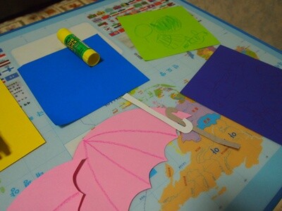 색종이를 접어서 앞과 뒤 표지에 우산그림을 붙여요.