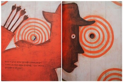 "먼저 화살을 모두 쏴요.그 다음에 화살 둘레에 물감을 칠하면 되요."