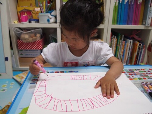 싸인펜으로 그린 기찻길위를 색종이 상자로 된 기차를 타고 친구들이 지나가고 있어요.