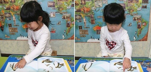 아빠황제펭귄이 알속에 있는 아기펭귄에게 해 주는 말들을 따라하며 보고 있어요.