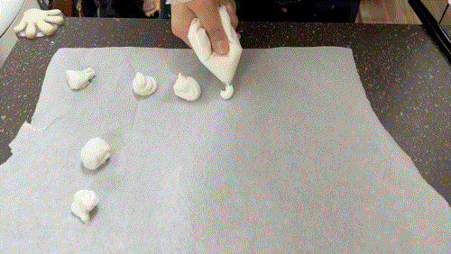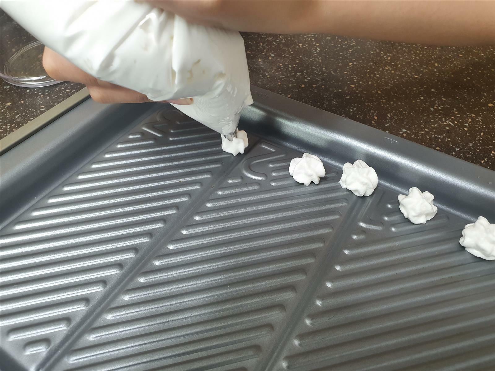 머랭이 푸석해질 수 있으니 팬에 일정한 간격으로 머랭을 짤 때